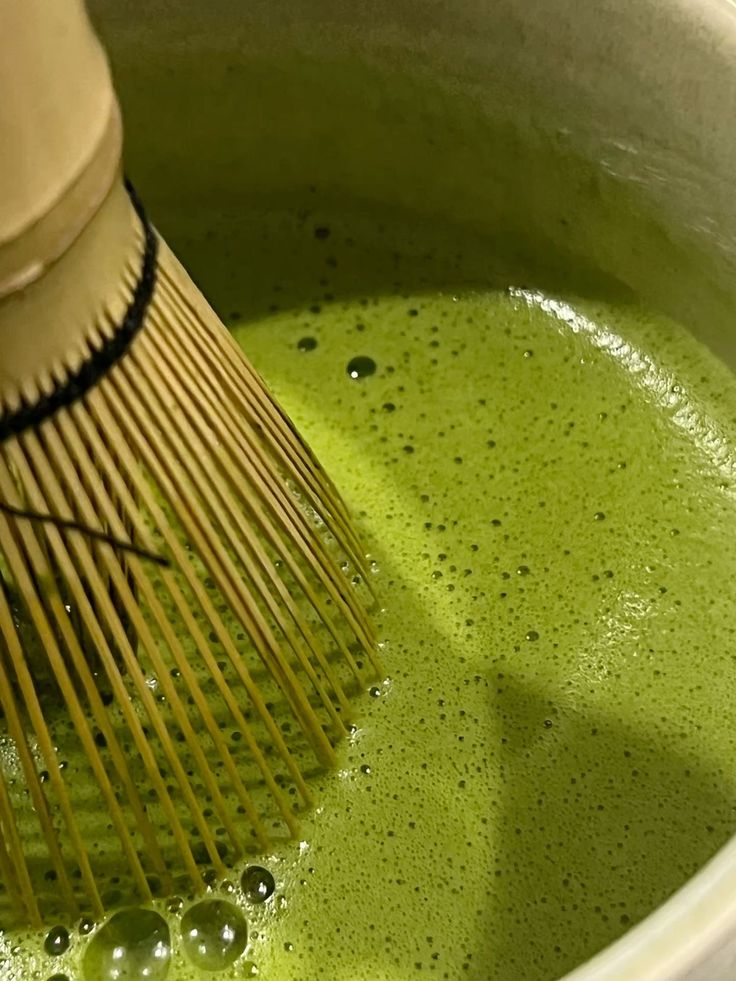 Um matcha perfeito começa com um pó de boa qualidade — vibrante, verde luminoso, sem amargor. A água não deve ferver; a temperatura ideal é entre 70 e 80 graus. O famoso chasen, o batedor de bambu, cria a espuma cremosa que transforma a bebida em uma experiência sensorial.