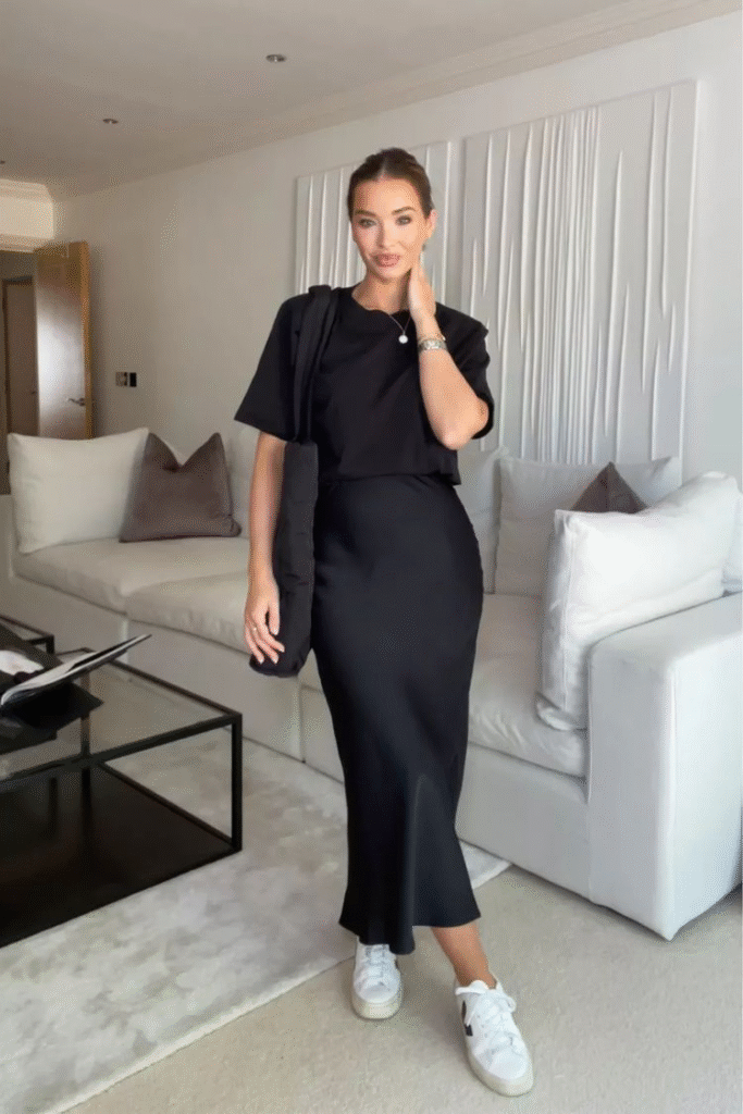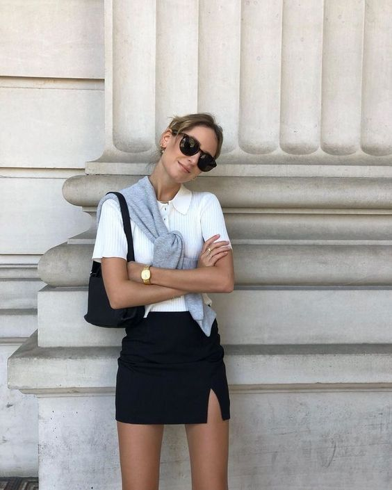 No verão, a saia preta é sinônimo de leveza urbana. Combinada a regatas de algodão, camisas oversized ou blusas de seda, ela cria um visual despretensiosamente elegante. Sandálias finas, mules ou tênis minimalistas completam o look com frescor e autenticidade.