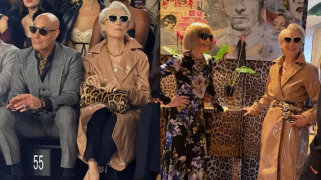 O atraso do show não foi causado por Naomi Campbell (dessa vez pontual), mas pela chegada triunfal de Meryl Streep, que surpreendeu o público ao aparecer vestida como sua icônica personagem Miranda Priestly, de O Diabo Veste Prada. A plateia vibrou com a aparição, especialmente quando ela surgiu acompanhada de Stanley Tucci, revivendo o papel de Nigel, o querido editor da Runway.