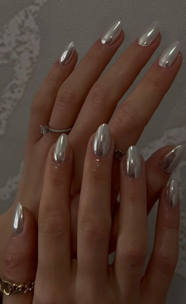 Dourado, cobre e bronze aparecem como detalhes ou em unhas inteiras. O toque metálico é tendência forte da temporada e deixa o look instantaneamente mais fashionista.